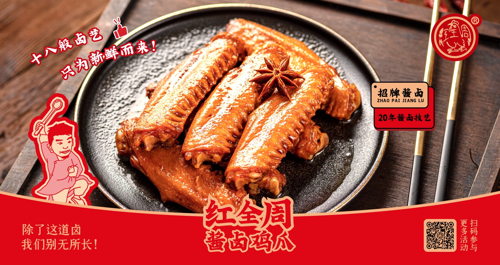 紅全周品牌創立于2012年,其生產總部坐落在以“紅全周雞爪”聞名的福建泉州市南安洪瀨鎮,經張福來師傅多年研制而成的獨家秘方,獨特的鹵制工藝,以“鮮、香、韌、辣”的特點,贏得廣大食客的交口稱贊。紅全周繼承中華美食傳統,堅持以“細微處見風范,毫厘間定乾坤”的服務準則,遵循現代健康飲食理念,精選上等食材,致力為消費者提供安全、健康的美食新體驗。